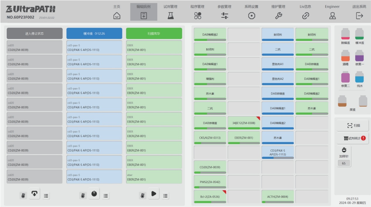 Ultra 30 N產(chǎn)品特點(diǎn): 精準(zhǔn)把控 獨(dú)立溫控組件:每張切片位點(diǎn)高精度獨(dú)立溫度控制,確保染色的精確性。 試劑用量可控:每張切片的加樣量可調(diào),最低至 80μl,減少試劑浪費(fèi)。 固體液蓋膜技術(shù):輔助試劑均勻鋪展,防止揮發(fā),提升染色質(zhì)量。 靈巧設(shè)計(jì) 雙模式放置:可按需配置為臺(tái)式 / 立式,以適應(yīng)不同空間需求。 多樣化功能:小設(shè)備,大作用,可執(zhí)行多樣化科室染色項(xiàng)目。 試劑區(qū)鎖定:試劑識(shí)別及運(yùn)行中可自動(dòng)鎖定試劑條,防止誤拔。 開放程序 并行多種染色模式:多種染色同步運(yùn)行,提升實(shí)驗(yàn)室效率。 個(gè)性化程序方案:程序開放可按需自由設(shè)置全流程。 多樣化修復(fù)模式:同批次染色可設(shè)置不同的修復(fù)液、溫度及時(shí)間。 智能監(jiān)測 智能識(shí)別系統(tǒng):雙重識(shí)別保障,多元條碼自動(dòng)高效識(shí)別。 軟件實(shí)時(shí)監(jiān)測:全程監(jiān)控,實(shí)時(shí)預(yù)警異常。 低液位預(yù)警:實(shí)時(shí)監(jiān)控液位,適時(shí)提示補(bǔ)液。