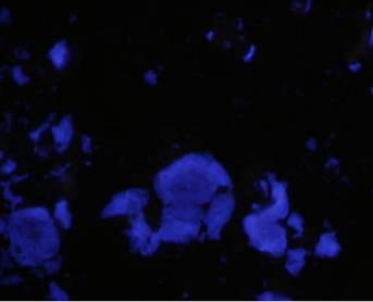 - 灶片狀著色 A. 裱片時(shí)水未排盡,或組織的局部形成氣泡使組織突起,染色時(shí)試劑滲入后不易洗盡,顯色過深。解決辦法是,漂片盒里的氣泡應(yīng)去盡,漂片時(shí)一旦產(chǎn)生了氣泡可將鑷子伸到水里從組織下面輕輕將氣泡移走。撈片后要傾斜放置幾分鐘利于水流走,然后在放到烤片儀上進(jìn)行烤片。B. 壞死組織灶,組織壞死后細(xì)胞破壞、酶的釋放、蛋白游離、分解,復(fù)雜的肽鏈殘段(如Fc段)可能與一抗或/和二抗結(jié)合導(dǎo)致最終著色。解決辦法是在選擇染色切片時(shí)應(yīng)避免選擇壞死組織較多的組織。C. 制作膠片時(shí),膠的濃度太高,膠在載玻片上不均勻,顯色時(shí)膠厚的地方容易非特異灶片狀著色。解決辦法是按照標(biāo)準(zhǔn)的制備方法進(jìn)行。
