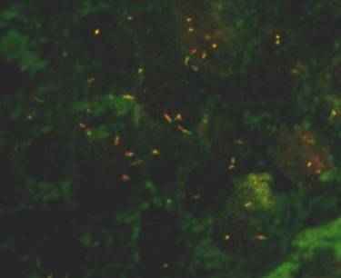 可能的原因 推薦的解決方案 未添加探針(別笑,特別是探針和雜交緩沖液分開的非預(yù)混情況) 探針充分解凍,確保移液器吸取到探針試劑。 探針、雜交緩沖液使用前沒有充分混勻(非預(yù)混探針) 吹打探針混合液,使探針充分混勻,短暫離心。 探針添加數(shù)量不足 確保移液器吸取準(zhǔn)確,探針加入量足量,請不要稀釋探針(包括預(yù)混和非預(yù)混)。 使用前確保探針解凍充分并達(dá)到室溫。 變性前標(biāo)本未制備好 請參照說明書中標(biāo)本制備相關(guān)說明。 標(biāo)本及探針變性不充分 確保玻片進(jìn)行變性時(shí)溫度在推薦的溫度。 將玻片變性時(shí)間延長2~4分鐘。 變性前標(biāo)本未制備好 請參照說明書中標(biāo)本制備相關(guān)說明。 標(biāo)本及探針變性不充分 確保玻片進(jìn)行變性時(shí)溫度在推薦的溫度。 將玻片變性時(shí)間延長2~4分鐘。 雜交條件不合適 確保遵守雜交所規(guī)定的時(shí)間和溫度。 橡皮膠封片時(shí)勿留縫隙。 根據(jù)情況,調(diào)整雜交時(shí)間(跨度一般較大)和濕度。 雜交時(shí)蓋玻片下有氣泡形成 放蓋玻片時(shí)要覆蓋探針表面,輕輕擠壓以便擠出氣泡。 玻片干燥不充分 探針滴加至玻片前,確保玻片上的乙醇溶液已經(jīng)完全揮發(fā)。 探針干燥太快 探針滴加后應(yīng)立即將蓋玻片覆蓋目標(biāo)區(qū)域。 進(jìn)行洗脫時(shí),一次只能移除一張玻片上的蓋玻片,并且在移除下一張之前立即將玻片浸入洗脫液中。 洗脫液或洗脫條件不正確 確保按照產(chǎn)品說明書要求配制洗脫液(生產(chǎn)商提供洗脫液的除外)。 確保洗脫液的溫度達(dá)到洗脫步驟所規(guī)定溫度。 玻片浸入洗脫液前移去蓋玻片。 探針或標(biāo)本玻片儲存不正確 確保探針-20℃避光保存。 將未雜交玻片干燥后置于-20℃長期保存或者室溫短期保存(一般不超過兩星期)。 將雜交后玻片置于-20℃避光保存。 觀察時(shí)所選用的濾光片不合適 使用正確濾光片觀察探針熒光情況。詳情咨詢探針供應(yīng)商。 顯微鏡構(gòu)造及物鏡不適宜觀察FISH標(biāo)本,或者濾片組損傷 請聯(lián)系顯微鏡制造商。 汞燈使用時(shí)間超過設(shè)計(jì)時(shí)間 請更換汞燈。